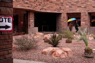 Yanira Graham, right, walks out of the Clark County Government Center with her mother Dolores Graham after voting…
