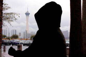 Sandy Brannum walks into the Clark County Government Center as the Las Vegas strip is seen in the…