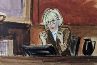 A courtroom sketch shows E. Jean Carroll testifying on the witness stand in Federal Court, in New York, on Wednesday,…