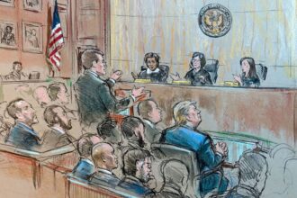 A court sketch depicts former President Donald Trump, seated right, listening as his attorney John Sauer, standing, speaks before the…