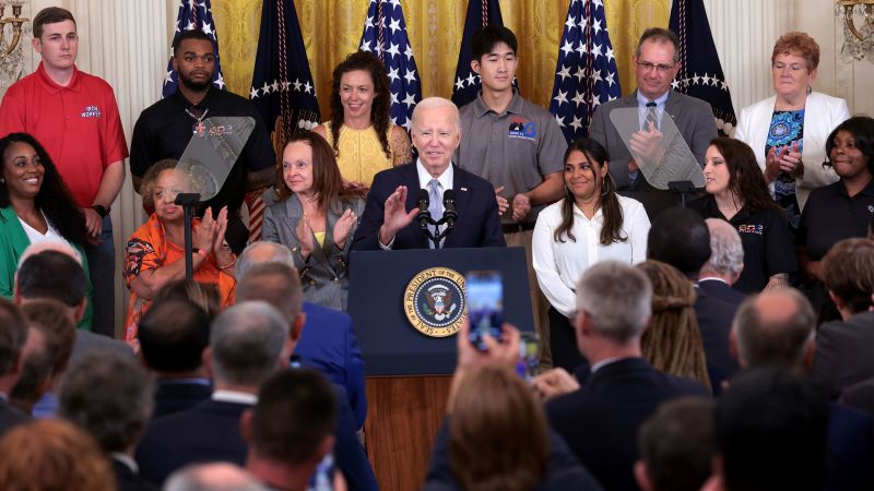 President Joe Biden celebrated the first anniversary of his administration’s signature climate and health care law on Wednesday – and knocked Republicans for opposing the measure during a lively event in the White House’s East Room.