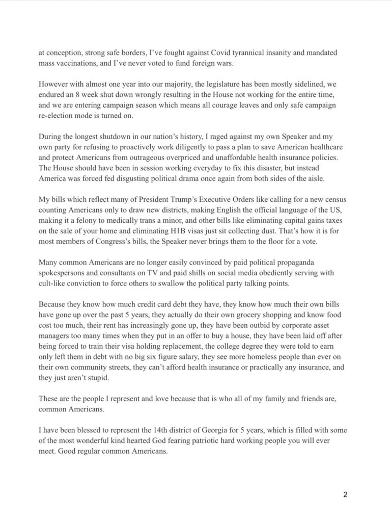 - She said she was frustrated that her legislative work stalled in what she called the “political-industrial complex” of both parties. Greene also noted that, even when Republicans were in control, Congress did not make real progress on her priorities.